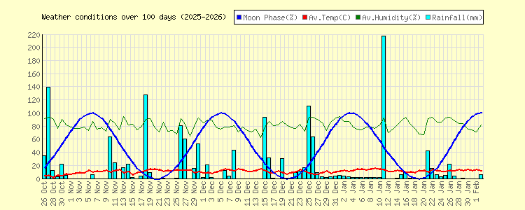 | Date | Moon Phase (%) | Mean Temp (ºC) | High Temp (ºC) | Low Temp (ºC) | Rainfall (mm) | Wind Avg (kmph) | Wind Gust (kmph) | Wind Dom Dir | Mean Barometer (mb) | Mean Humidity (%) |